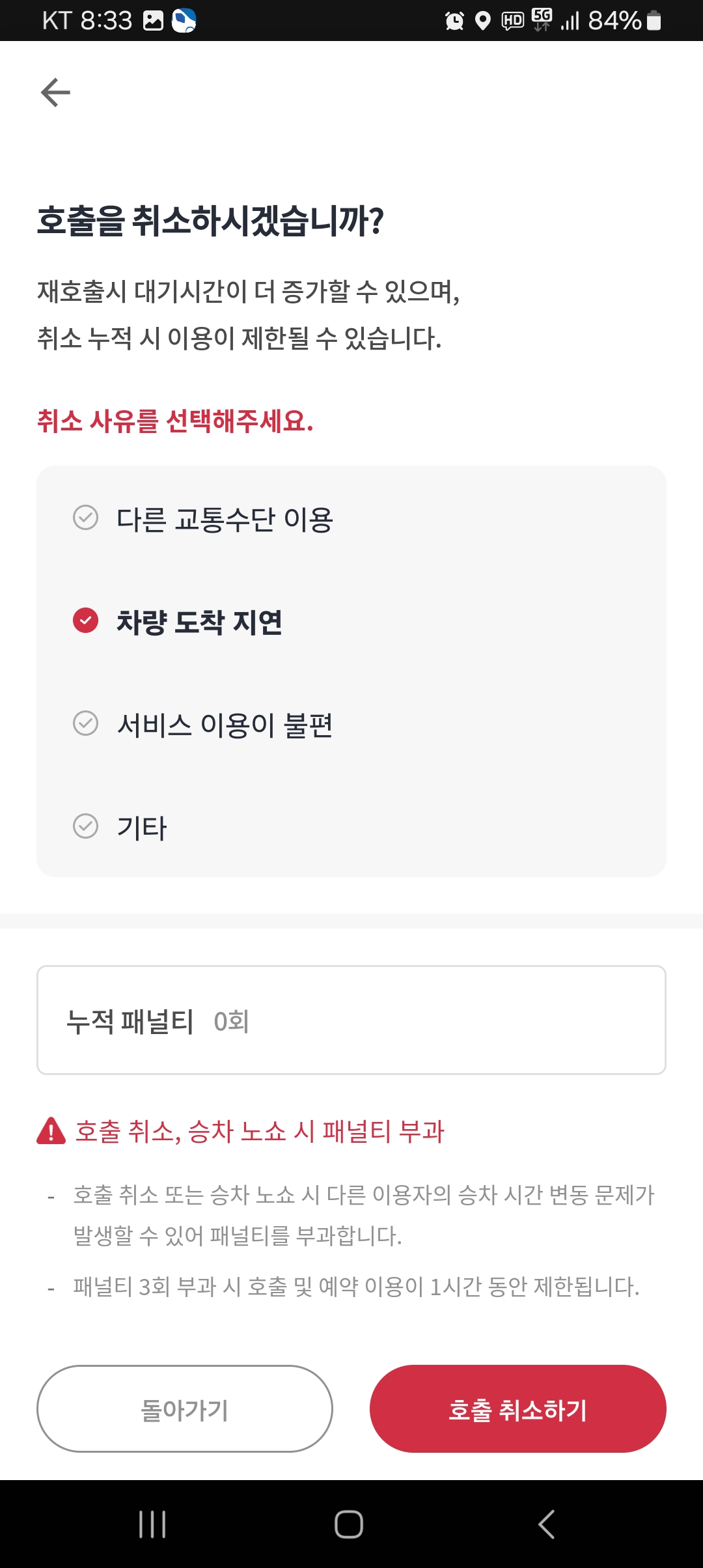 도착시간이 얼마 남지 않은 상태에서는 취소가 되지 않고 패널티가 부과 되면 이용시간이 제한됩니다.