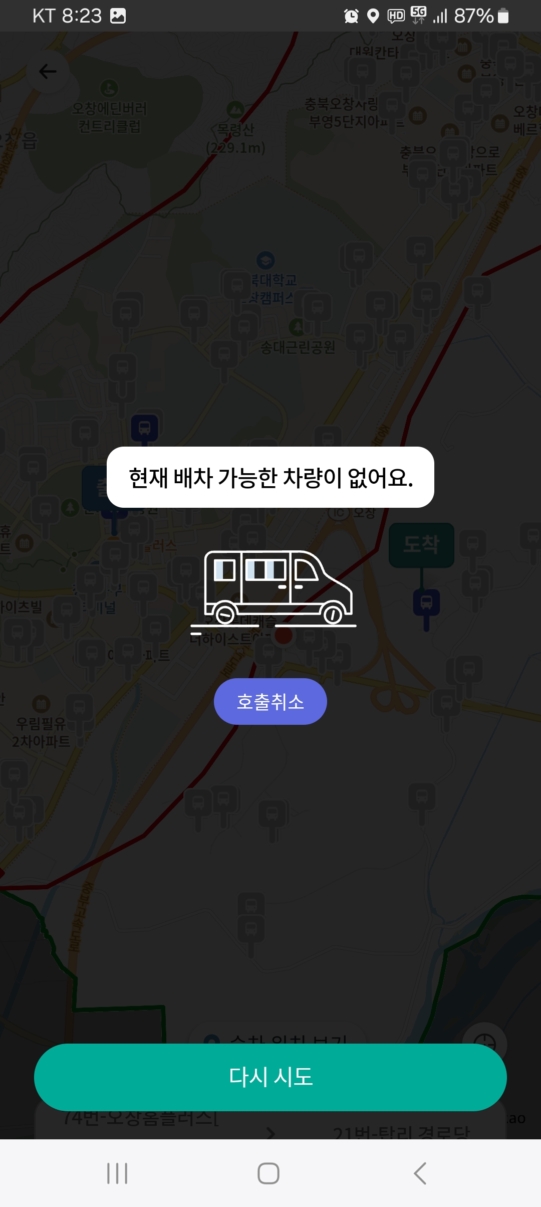 배차시간이 너무 길어 이용 할 수 없을 때 우측 상단 호출 취소를 눌러 줍니다