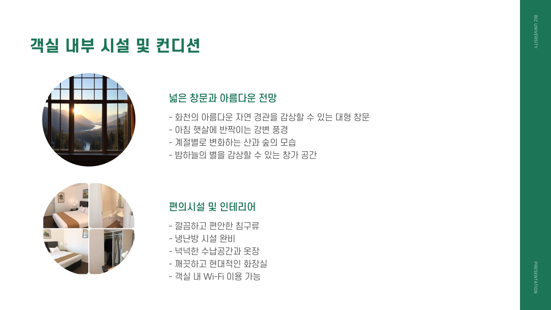 방 내부는 목재 인테리어와 넓은 창문 덕분에 화천의 아름다운 풍경을 감상하기에 딱이에요.