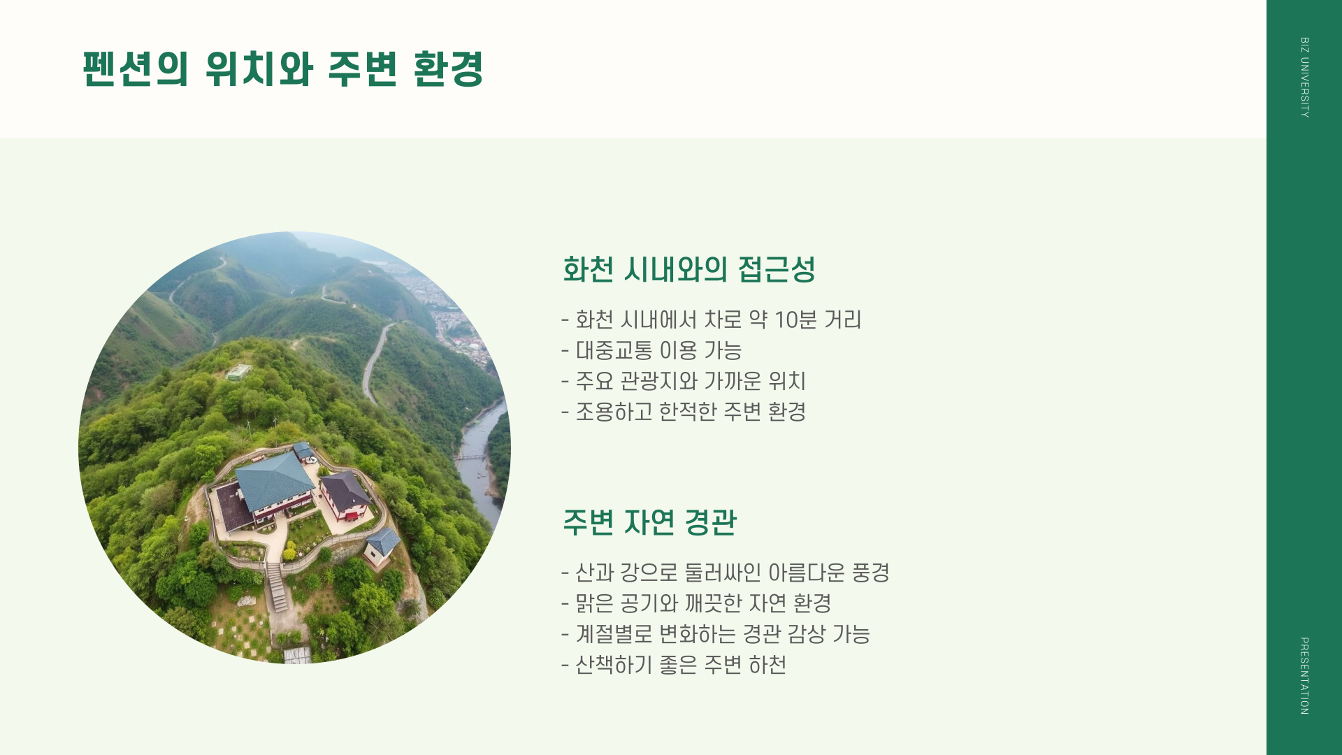 펜션은 화천 시내에서 차로 약 10분 거리로 접근성이 좋아요. 🚗