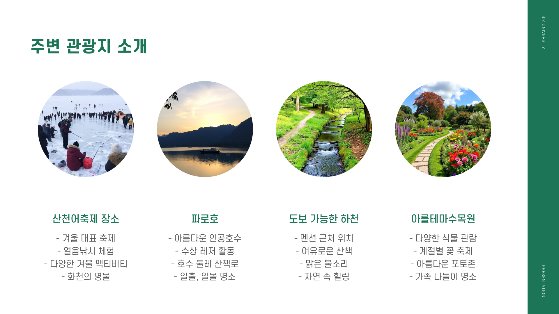 주변에 유명한 산천어 축제 장소와 파로호 등이 있어 관광하기에도 편리하답니다.